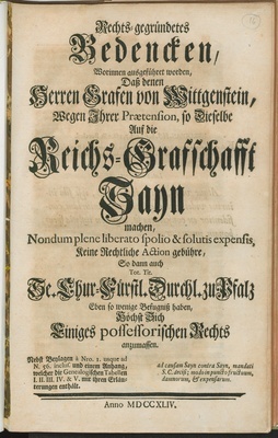 Rechts-gegründetes Bedencken, Worinnen ausgeführet worden, Daß denen Herren Grafen von Wittgenstein, Wegen Ihrer Praetension, so Dieselbe Auf die Reichs-Grafschafft Sayn machen, Nondum plene liberato spolio & solutis expensis, Keine Rechtliche Action gebühre, ... : nebst Beylagen ... und einem Anhang, welcher ... enthält / [Heinrich Christian von Senckenberg]