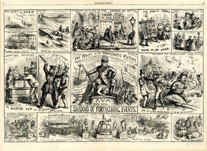 Shadows of forthcomming events : die Zeichnung besteht aus 13 Bildern. Inschrift der Zeichnung: Shadows of forthcomming events. In den einzelnen Darstellungen wird die Politik des Tammany Rings als demagogisch, korrupt und gewalttätig charakterisiert / Th. Nast