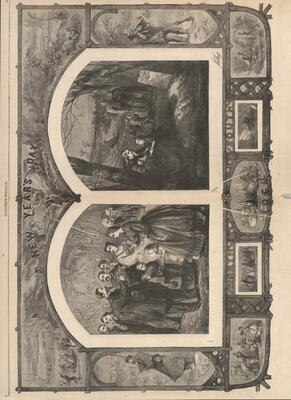 New Year's Day : die Zeichnung besteht aus 12 Bildern, von denen 2 beschrieben werden: Inschrift der Zeichnung: New Year's Day. North. South. 1864. 1) Eine großzügig ausgerichtete Neujahrsfeier in den Nordstaaten. 2) In den Südstaaten sitzt eine Frau mit Kindern vor einem Grab / Th. Nast