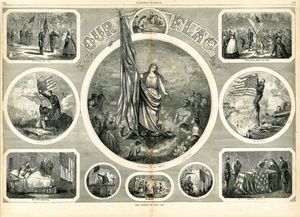 The Fourth of July, 1864 : die Zeichnung besteht aus 11 Bildern. Inschrift der Zeichnung: Our Flag. Die Flagge begleitet den Soldaten bei seinem Auszug in den Krieg, im Kampf, bei seiner Heimkehr aus dem Krieg oder bis zu seinem Tod / Th. Nast