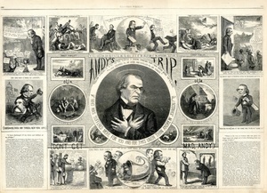 Andy's Trip : die Zeichnung besteht aus 21 Bildern und aus 2 Textblöcken. Inschrift der Zeichnung: Andy's Trip. Die Bilder beziehen sich auf eine Wahlkampfreise von Andrew Johnson, die satirisch dargestellt wird / Th. Nast