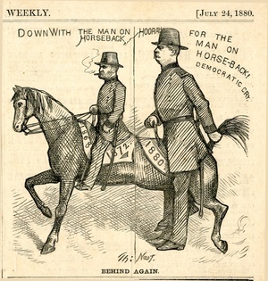 Behind again : die Zeichnung besteht aus 2 Bildern, die in der Reihenfolge von links nach rechts beschrieben werden: 1) General Grant reitet auf einem Pferd. Inschrift der Zeichnung: Down with the man on horseback. 2) General Hancock steht über einem Pferd und hält sich an dessen Schwanz fest. Inschrift der Zeichnung: Hoorah for the man on the horse- back! Democratic cry / Th. Nast