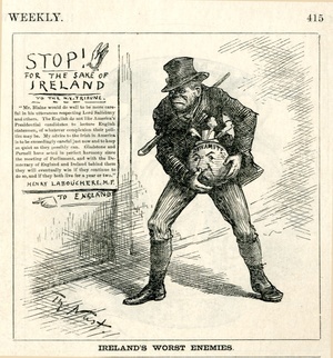 Ireland's worst enemies : ein irischer Terrorist trägt eine Bombe nach England. [In der Zeichnung befindet sich ein Textblock] / Th. Nast