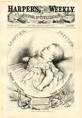 More food for the cannibal press : die Zeichnung besteht aus 2 Bildern, von denen eines erläutert wird. In der Zeichnung befindet sich ein Textblock. Darstellung eines schlafenden Säuglings. Text: Grantism, Nepotism, Third Termism, Third Generationism / Th. Nast