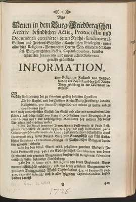 Aus Denen in dem Burg-Friedbergischen Archiv befindlichen Actis, Protocollis und Documentis extrahirte, denen Reichs-fundamental-Gesätzen und Friedens-Schluessen, Kayserlichen Privilegien, unter alleerseits Religions-Verwandten Herren Mit-Gliedern der Kayserl. Burg errichteten Pactis, Capitulationibus, darueber erstatteten Juramentis und unverruckter Observanz gemäße gruendliche Information, Den Religions-Zustand und Beschaffenheit der Kayserl. und des Heil. Reichs Burg Friedberg in der Wetterau betreffend