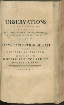 Observations Sur Une Piéce Publiée Par La Maison Electorale Palatine De Neubourg Et Par Celle De Sultzbach Sous Le Titre De Vraye Exposition Du Fait Dans L'Affaire De Juliers &c. Contre La Maison Royale Electorale Et Ducale De Saxe