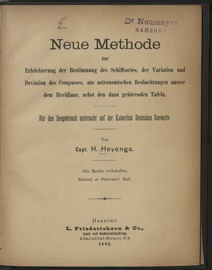 Neue Methode zur Erleichterung der Bestimmung des Schiffsortes, der Variation und Deviation des Compasses, aus astronomischen Beobachtungen, ausser dem Meridiane, nebst den dazu gehörenden Tafeln : für den Seegebrauch untersucht auf der Kaiserlich Deutschen Seewarte / von Capt. H. Heyenga