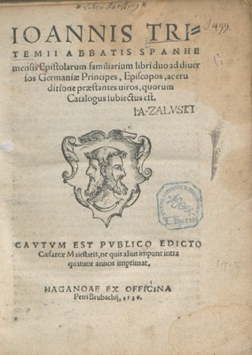 IOANNIS TRI=||TEMII ABBATIS SPANHE||mensis Epistolarum familiarium libri duo ad diuer||sos Germaniae Principes,Episcopos,ac eru||ditione praestantes uiros : quorum Catalogus subiectus est