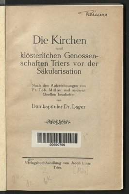 Die Kirchen und klösterlichen Genossenschaften Triers vor der Säkularisation / Nach d. Aufzeichnungen von Fr. Tob. Müller u. anderen Quellen bearb. von Lager