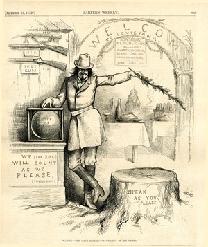 Waving "the olive branch", or wearing of the tweed : ein Südstaatler steht neben einer Wahlurne und schwenkt einen Olivenzweig / Th. Nast