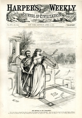 The Republic is not ungrateful. [Anschließend folgt ein Textblock] : auf Grant werden Pfeile abgeschossen, die Lügen darstellen. Columbia wehrt die Geschosse mit dem Schild der Wahrheit ab / Th. Nast