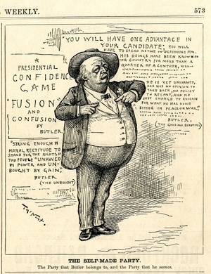 The self-made Party. The Party that Butler belongs to, and the Party that he serves : Benjamin Butler steht vor einer Plaketwand. [In der Zeichnung befinden sich 3 Textblöcke] / Th. Nast