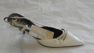 Weiße Damensandalette mit Zierbändern und -knöpfen