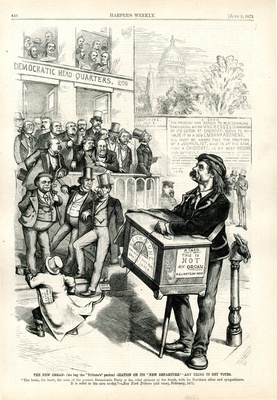 The new organ - (we beg the "Tribune's" pardon) -ization on its "New departure." - Any thing to get votes. [Anschließend folgt ein Textblock] : Whitelaw Reid tritt vor einer Menschenmenge als Leierkastenmann auf und Greeley, als Affe dargestellt, sammelt mit einer Büchse Wählerstimmen ein / [Thomas Nast]