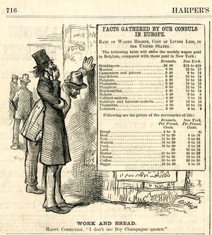 Work and bread. Happy communist. "I don't see Dry Champagne quoted." : Kommunisten lesen ein Plakat, auf dem Löhne und Preise in Brüssel und New York verglichen werden. [In der Zeichnung befindet sich ein Textblock] / Th. Nast