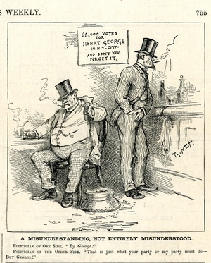 A misunderstanding, not entirely misunderstood. Politician of one side. "By George!" Politician of the other side. "That is just what your party or my party must do- Buy George!" : zwei Politiker überlegen, ob es nicht besser wäre, Henry George, der bei der Wahl zum Bürgermeister von New York 68.000 Stimmen erhalten hatte, für ihre Partei zu kaufen / Th. Nast