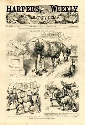 The horse and his rider : die Zeichnung besteht aus 3 Bildern, die in der Reihenfolge von links oben nach rechts unten beschrieben werden. In der Zeichnung befinden sich 3 Textblöcke. 1) Uncle Sam füttert ein Pferd, das die USA darstellt. 2) Uncle Sam lässt das Pferd schwere Lasten schleppen. 3) Bei einem Kavallerieangriff bricht das Pferd unter Uncle Sam zusammen / Th. Nast