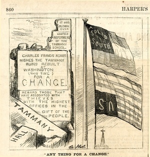 "Any thing for a change." : neben den Trümmern der Tammany Hall weht die Flagge der Südstaaten über der Flagge der USA / Th. Nast