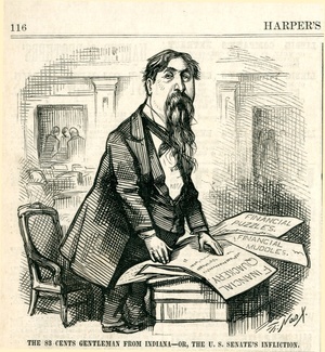 The 83 Cents gentleman from Indiana - or, the U.S. Senate's infliction : der demokratische Senator von Indiana, Daniel Voorhees, wird als unfähiger Finanzpolitiker dargestellt / Th. Nast
