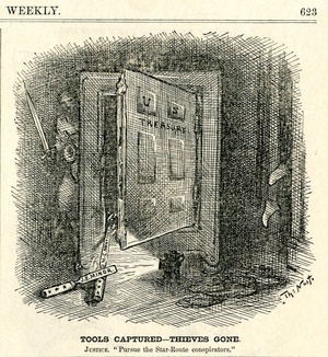Tools captured - thieves gone. Justice. "Pursue the Star-Route conspirators." : Justitia findet vor einem aufgebrochenen Tresor Werkzeug. Die Diebe sind geflohen / Th. Nast