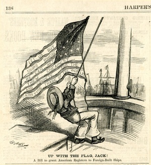 Up with the flag, Jack! A Bill to grant American Registers to Foreign-Built Ships : ein Matrose hißt eine Flagge, mit der zum Kauf von Schiffen aufgefordert wird, um damit im Welthandel zu konkurrieren / Th. Nast