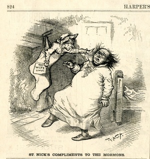 St. Nick's compliments to the Mormons : eine Frau, die in einem Strumpf an einem Kamin hängt, ohrfeigt eine Mormonen / Th. Nast