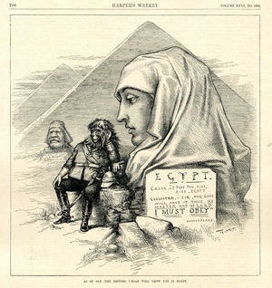As of old (the british) Caesar will grow fat in Egypt : der britische Löwe sitzt vor einer Büste von Kleopatra. Im Hintergrund wird Arabi Pascha als Sphinx dargestellt / Th. Nast