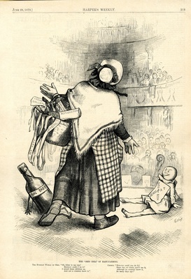 The "Ohio idea" of baby-farming. [Anschließend folgt ein Textblock] : eine Schauspielerin, die die Demokratische Partei von Ohio darstellt, tritt zusammen mit einer Schnapsflasche und einer Stoffpuppe auf einer Theaterbühne auf / Th. Nast