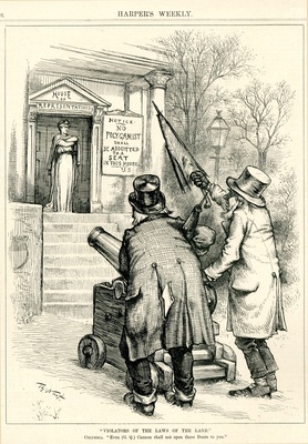 Violators of the laws of the land. Columbia. "Even (G.Q.) Cannon shall not open these Doors to you." : Mormonen bedrohen das Repräsentantenhaus, zu dem Columbia ihnen den Zutritt verwehrt, mit einer Kanone / Th. Nast