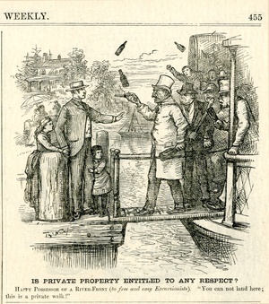 Is private property entitled to any respect? Happy possessor of a river- front (to free and easy Excursionists). "You can not land here; this is a private walk!" : ein Mann versucht sich Ausflüglern entgegenzustellen, die mit ihrem Boot an seinem Grundstück angelegt haben und an Land gehen wollen / Th. Nast