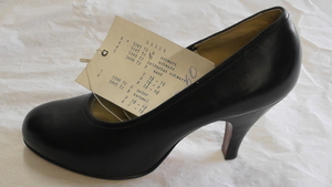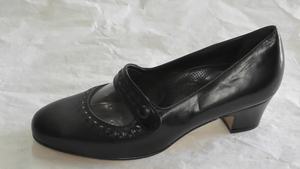 Schwarzer Pumps mit Knopfverschluss und Zierflechtungen