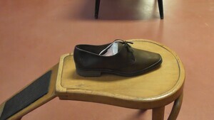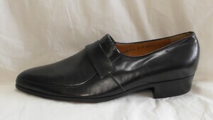 Schwarzer Herrenhalbschuh mit Zierriemen und -einschnitten.