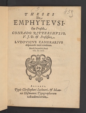 THESES || De || EMPHYTEVSI.|| Eas Praeside || CONRADO RITTERSHVSIO.|| V.J.D. et Professore,|| LVDOVICVS CAMERARIVS || disputando tueri conabitur.|| Mense Decembri, Anni || M D XCI.||