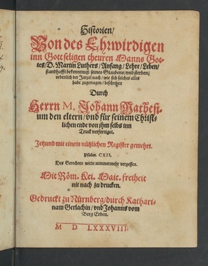 Historien, Von des ehrwirdigen in Gott Seligen theuren Manns Gottes, D. Martin Luthers, Anfang, Lehre, Leben, standhafft bekenntnuß seines Glaubens, und sterben : ordenlich der Jarzal nach, wie sich solches alles habe zugetragen; jetzund mit einem nützlichen Register gemehrt / beschrieben durch Johann Mathesium den Eltern, und ... von jhm selbs inn Truck verfertiget ...