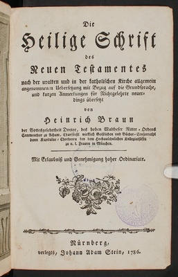 Die Heilige Schrift des Neuen Testamentes ; nach der uralten und in der katholischen Kirche allgemein angenommenen Uebersetzung mit Bezug auf die Grundsprache, und kurzen Anmerkungen für Nichtgelehrte / neuerdings übersetzt von Heinrich Braun der Gottesgelehrtheit Doctor, des hohen Maltheser Ritter-Ordens Commenthur zu Acham ...