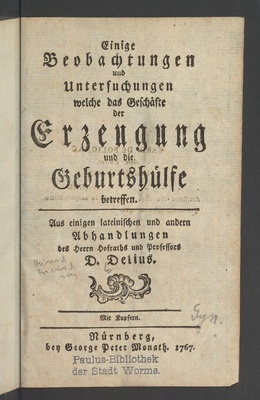 Einige Beobachtungen und Untersuchungen welche das Geschäfte der Erzeugung und die Geburtshülfe betreffen / Aus einigen lateinischen und andern Abhandlungen des Herrn Hofraths und Professors D. Delius