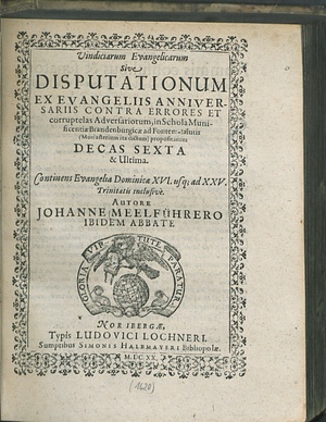 Vindiciarum Evangelicarum Sive Disputationum Ex Evangeliis Anniversariis, Contra Errores Et corruptelas Adversariorum in Schola Monasterii Heilsbronnensis propositarum Decas ... / Antehac sparsim edita, nunc vero in huius Decadis fasciculum collecta Autore Johanne Meelführero Ibidem Abbate