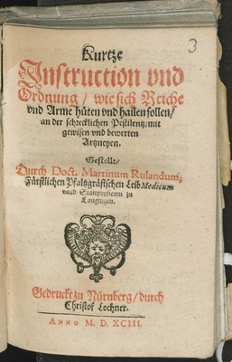 Kurtze || Jnstruction vnd || Ordnung/ wie sich Reiche || vnd Arme hüten vnd hailen sollen/|| an der schrecklichen Pestilentz/ mit || gewisen vnd bewerten || Artzneyen.|| Gestellt/|| Durch Doct. Martinum Rulandum,|| Fürstlichen Pfaltzgräfischen LeibMedicum || vnnd Stattphysicum zu || Laugingen.||