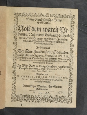 Von dem waren Ursprung Nutzen der heylsamen WildtBrunnen und Bäder : insonderheit aber deß namhafften WildBads zu BurgBernheim in Francken ; BurgBernheimische WildtBads Predig / in Gegenwart der Durchleuchtigsten Hochgebornen Fürstin und Frauen Sophiae gehalten von Christophoro Zeaemanno