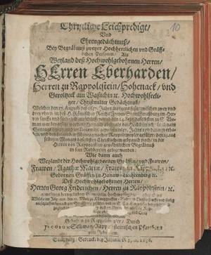 Christliche Leichpredigt/ Vnd Ehrengedächtnuß/ Bey Begräbnuß zweyer Hochherrlichen Gräfflichen Personen/ Als Weyland des Hochwohlgebohrnen Herren/ HErren Eberharden/ Herren zu Rappoltstein/ Hohenack ... Hochwohlseeliger/ Christmilter Gedächtnuß/ Welcher den 17. Augusti deß 1637. Jahrs ... in ... Straßburg im Herren sanfft vnd seliglich entschlaffen/ vnd den 14. Sept. daselbsten zu S. Thoman war beygesetzt worden/ hernach aber/ als der Hochherrliche Leichnam ... von dannen erhaben/ vnd nach er Rappolsweyler geführt ... in der Herren von Rappolstein gewöhnlichen Begräbnuß in sein Ruhbettlin gelegt worden: Wie dann auch Weylandt der Hochwohlgebornen ... Frawen/ Agathae Mariae/ Frawen zu Rappoltstein [et]c. Gebornen Gräffin zu Hanaw-Liechtenberg [et]c. ... Welche im Jahr 1636. den 25. Maij ... in Christo sanfft und seelig entschlaffen/ hernach gen Straßburg geführt ... vnd beygesetzt ... / Gehalten ... Durch Jacobum Selbman/ Rappoltsteinischen Pfarrherr ...