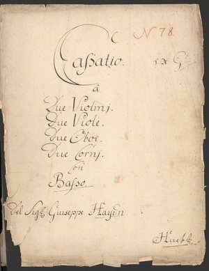 Cassatio ex G : a due violini, due viola, due corni con basso ; (Hob. II/9) / del Sig. Giuseppe Haydn