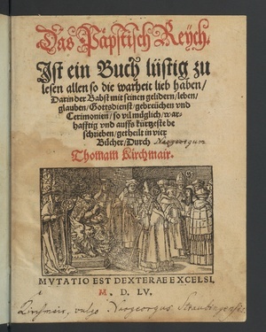 Das päpstisch Reych : ist ein Buch lüstig zu lesen allen so die warheit lieb haben ; darin der Babst mit seinen gelidern leben glauben Gottsdienst gebreüchen und Cerimonien so viel müglich warhafftig und auffs kürtzeste beschrieben, getheilt in vier Bücher / durch Thomam Kirchmair. [Übers.: Burkard Waldis]