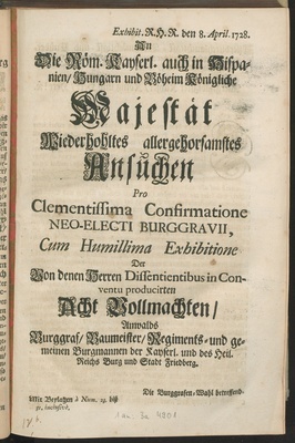 An Die Röm. Kayserl. auch in Hispanien, Hungarn und Boeheim Königliche Majestät Wiederhohltes allergehorsamstes Ansuchen Pro Clementissima Confirmatione Neo-Electi Burggravii : Cum Humillima Exhibitione der von denen Herren Dissentientibus in Conventu producirten Acht Vollmachten, Anwalds Burggraf Baumeister Regiments- und gemeinen Burgmannen der Kayserl. und des heil. Reichs Burg und Stadt Friedberg. ; Die Burggrafen-Wahl betreffend / [Johann Christoph Schlegel]