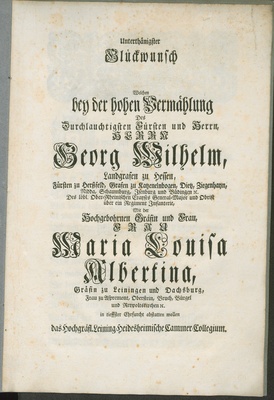 Unterthänigster Glückwunsch, Welchen bey der hohen Vermählung Des Durchlauchtigsten Fürsten und Herrn, Herrn Georg Wilhelm Landgrafen zu Hessen, Fürsten zu Herßfeld, Grafen zu Katzenelnbogen, Dietz, Ziegenhayn, Nidda, Schaumburg, Isenburg und Büdingen [et]c. ... Mit der Hochgebohrnen Gräfin und Frau, Frau Maria Louisa Albertina, Gräfin zu Leiningen und Dachsburg, Frau zu Aspremont, Oberstein, Bruch, Bürgel und Reypoltskirchen [et]c. in tieffster Ehrfurcht abstatten wollen / das Hochgräfl. Leining-Heidesheimische Cammer-Collegium