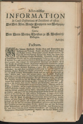 Acten-mässige Information In Causa Destitutionis & Deiectionis ab officio Des Heil. Röm. Reichs Freyherrn von Wollzogen, Klägern Contra Dem Herrn Hertzog Christian zu S. Weissenfelß, Beklagten : Rescripti