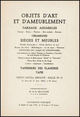 Objets d'art et d'ameublement : tableaux, aquarelles : cuivres, étains, marbres, bois sculptés, bronzes : céramiques : sièges et meubles : meuble d'entre-deux, vitrine bonheur du jour, bureau dos d'âne, bibliothèques, lit de repons, paravents, commode en laque de coromandel, ameublement de salle à manger et chambre à coucher de style Empire et Moderne, pianos à queue et demi-queue "Érard" et "Steinway" : miroir brot, grillé en fer forgé : lustres, appliques, candélabres : tapisseries des Flandres : tapis : vente Hôtel Drouot, Salle No 12 le mercredi 17 juin 1942 / commissaire-priseur: D.H. Beaudoin