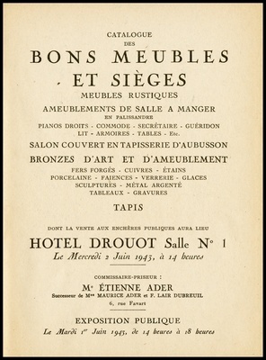 Catalogue des bons meubles et sièges : meubles rustiques : ameublements de salle à manger en palissandre : pianos droits, commode, secrétaire, guéridon, lit armoires, tables, etc. : salon couvert en tapisserie d'Aubusson : bronzes d'art et d'ameublement : fers forgés, cuivres, étains, porcelaine, faïences, verrerie, glaces, sculptures, métal argenté, tableaux, gravures : tapis : dont la vente aux enchères publiques aura lieu Hôtel Drouot, Salle No 1 le mercredi 2 juin 1943 / commissaire-priseur: Étienne Ader, successeur de Maurice Ader et F. Lair Dubreuil