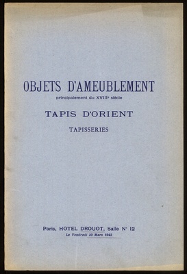 Catalogue des tableaux anciens : objets variés : porcelaines et faïences : objets de vitrine : étains, pendules, bronzes : rétable espagnol du XVIe siècle : sièges et meubles : principalement du XVIIIe siècle : fauteuils, chaises, bergères, mobliliers de salon .... : tapis d'Orient : tapisserie de Beauvais : dont la vente aux enchères publiques aura lieu Hôtel Drouot, Salle No 12 le vendredi 20 mars 1942 / commissaire-priseur: Étienne Ader, successeur de Maurice Ader et F. Lair Dubreuil ; assisté de: Bernard Dillée, expert près le Tribunal civil de la Seine
