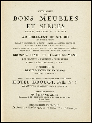 Catalogue des bons meubles et sièges : anciens, modernes et de styles : ameublement de studio en noyer verni : salle à manger en acajou, salle à manger rustique, chambre à coucher en palissandre, bureau bonheur du jour, bureau dos d'âne, coiffeuse, tables, commode, clavecin, buffets, armoires, coffres : bronzes d'art et d'ameublement : porcelaines, faïences, sculptures : étains, métal argenté, glaces : fourrures : beaux manteaux en vison, zibeline, loutre : dont la vente aux enchères publiques aura lieu Hôtel Drouot, Salle No 1 le mercredi 27 janvier 1943 / commissaire-priseur: Étienne Ader, successeur de Maurice Ader et F. Lair Dubreuil