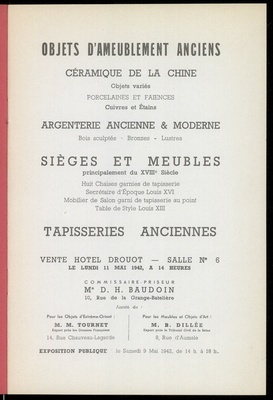 Objets d'ameublement anciens : céramique de la Chine : objets variés : porcelaines et faïences : cuivres et étains : argenterie ancienne & moderne : bois sculptés, bronzes, lustres : sièges et meubles : principalement du XVIIIe siècle : huit chaises garnies de tapisserie, secrétaire d'époque Louis XVI, mobilier de Salon garnie de tapisserie au point, table de style Louis XIII : tapisseries anciennes : vente Hôtel Drouot, Salle No 6 le lundi 11 mai 1942 / commissaire-priseur: D.H. Baudoin ; assisté de: Pour les objets d'Extrême-Orient: M. Tournet, pour les meubles et objets d'art: B. Dillée